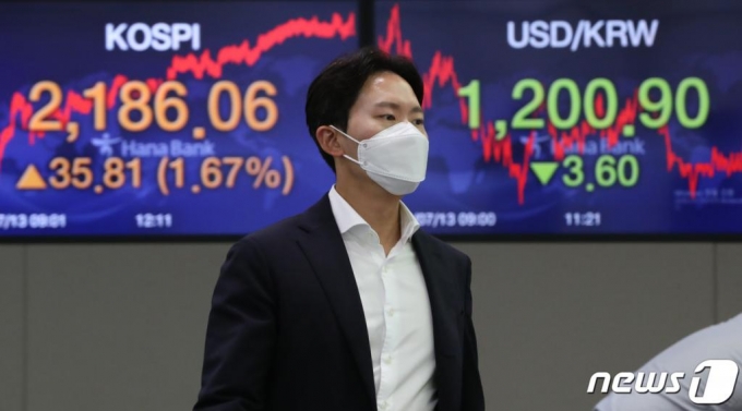 | (서울=뉴스1) 허경 기자 = 13일 서울 중구 KEB하나은행 명동점 딜링룸 전광판에 코스피 지수가 전 거래일보다 35.81포인트(1.67%) 오른 2,186.06을 나타내고 있다. 코스닥은 전 거래일보다 8.38포인트1.08%) 오른 781.19를 원/달러 환율은 3.60원 내린 1200.90원에 거래를 마쳤다. 2020.7.13/뉴스1 |