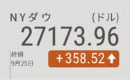 【NQNニューヨーク=戸部実華】25日の米株式市場でダウ工業株30種平均は続伸した。前日比358ドル52セント(1.3%)高の2万7173ドル96セントで終えた。朝方は売りが先行したが、主力ハイテク株の上昇が市場心理の支えとなり、昼前に上げに転じた。景気敏感株の一角にも買いが入り、取引終了にかけて上げ幅を広げた。