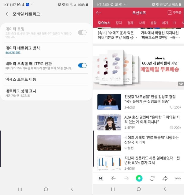 김씨는 "통신사에 문의하니 상담원이 LTE 모드로 놓고 쓸 것을 권유해 황당했다"라면서 "5G가 빠르다고 해서 스마트폰을 바꾸고 9만원대 데이터 무제한 요금제까지 썼지만, 최근 데이터 제한이 있는 5만원대 요금제로 바꿨다"고 했다.