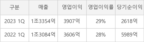 영업이익률을 자세히 살펴보면, 매출은 1조3354억으로 전년동기 대비해서 2.1% 증가한 반면, 영업이익은 3907억으로 8.3% 증가하였다. 매출은 크게 변하지 않았지만 영업이익이 증가하여 영업이익률도 상승한 것을 알 수 있다.